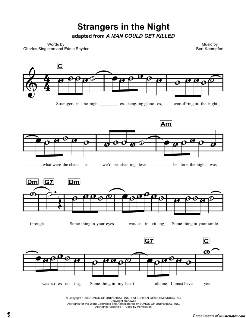 Strangers in the night exchanging glances, wond'ring in the night what were the chances we'd be sharing love before the night was through. |