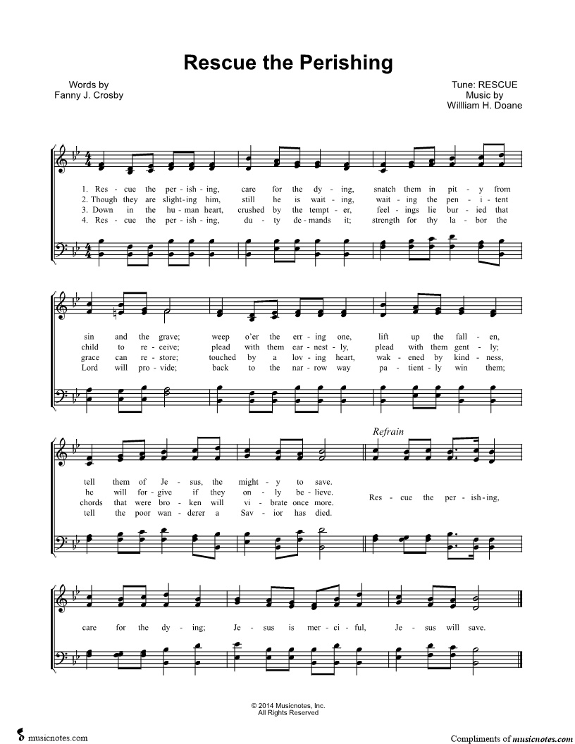 Rescue the perishing, care for the dying, snatch them in pity from sin and the grave; weep o'er the erring one, lift up the fallen, tell them of Jesus, the mighty to save. |