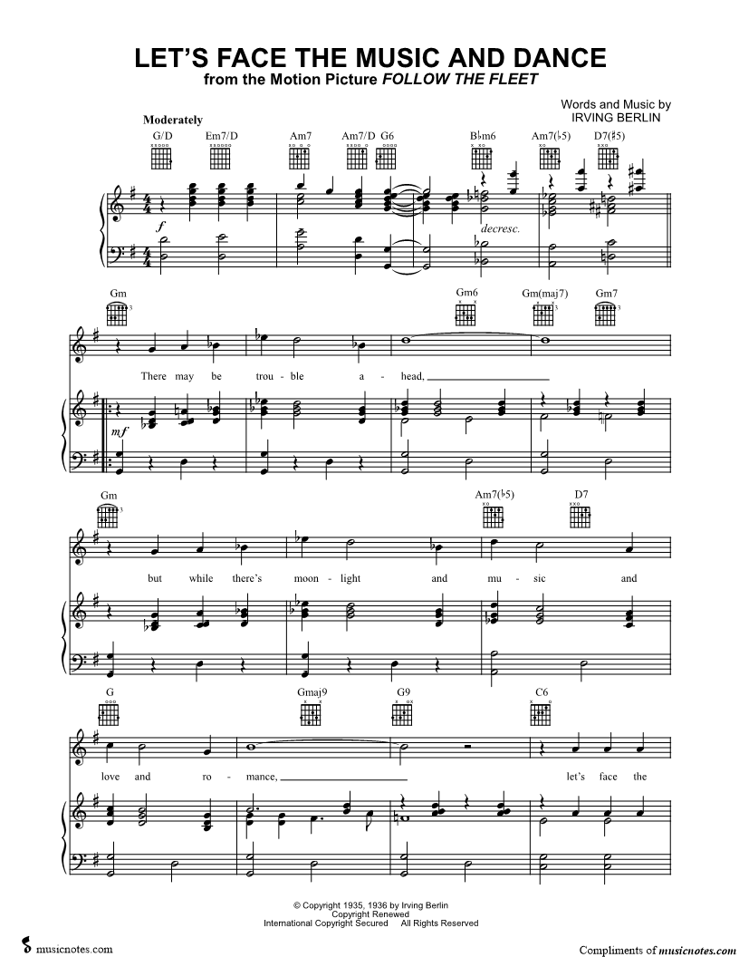 There may be trouble ahead, but while there's moonlight and music and love and romance, let's face the music and dance. |