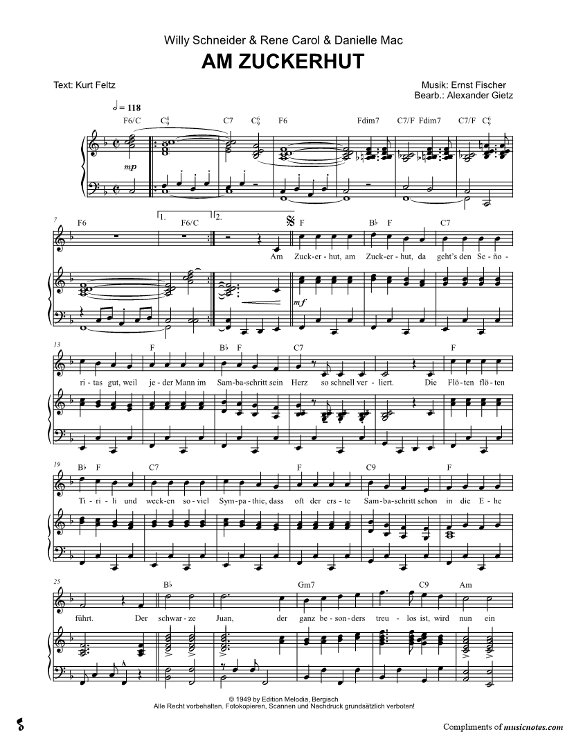Am Zuckerhut, am Zuckerhut, da geht's den Señoritas gut, weil jeder Mann im Sambaschritt sein Herz so schnell verliert. |