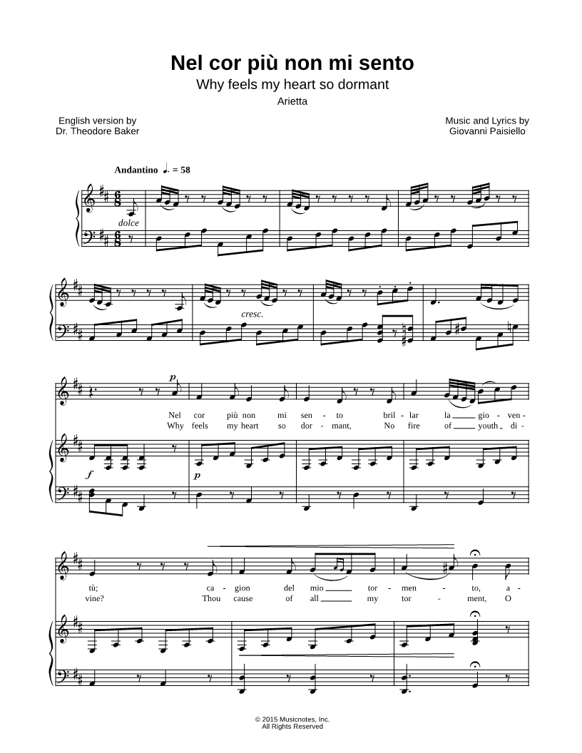 Nel cor più non mi sento brillar la gioventù; cagion del mio tormento, amor, sei colpa tu. |