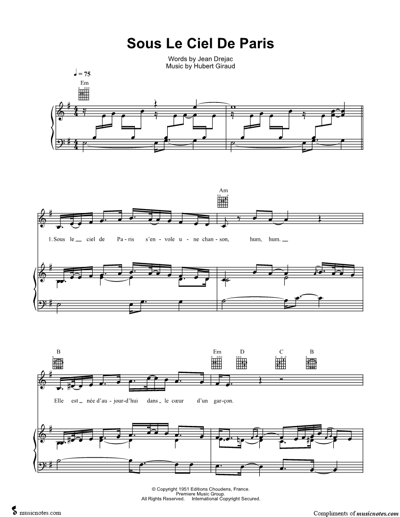 Sous le ciel de Paris s'envole une chanson, hum, hum. |