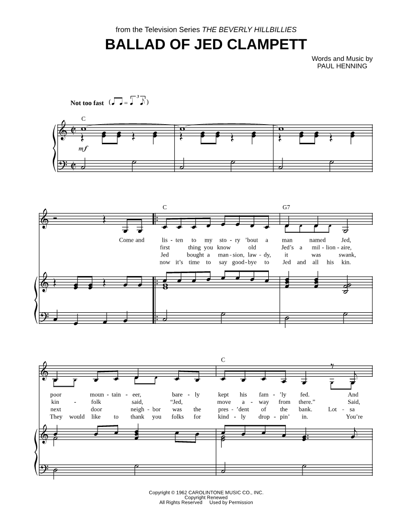Come and listen to my story 'bout a man named Jed, poor mountaineer, barely kept his fam'ly fed. |