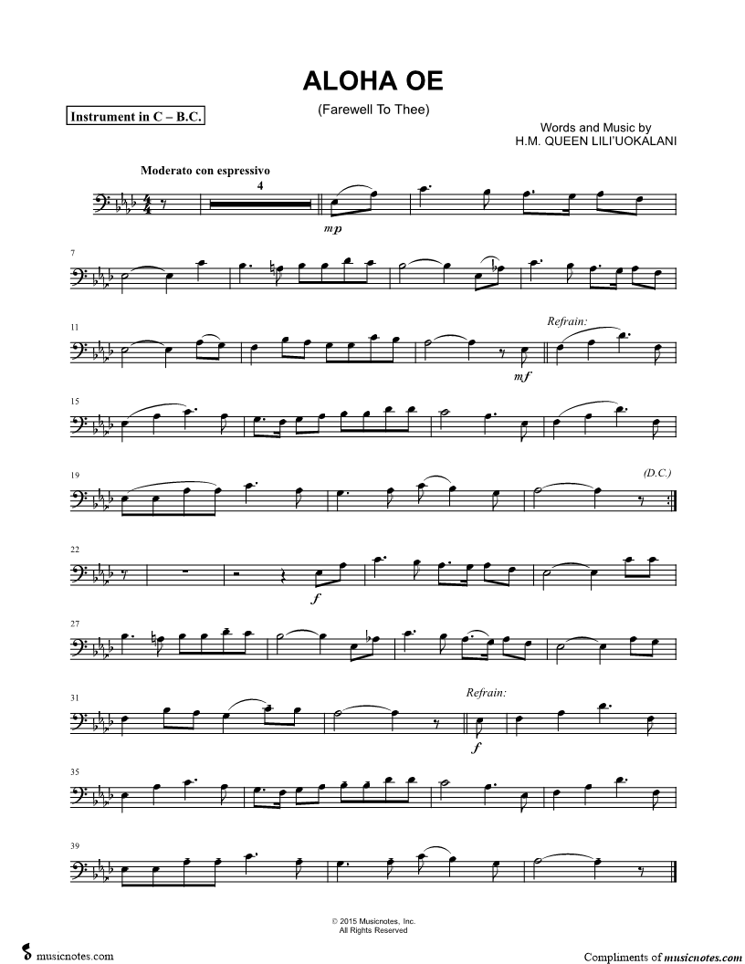 Aloha Oe - Bass Clef Instrument |