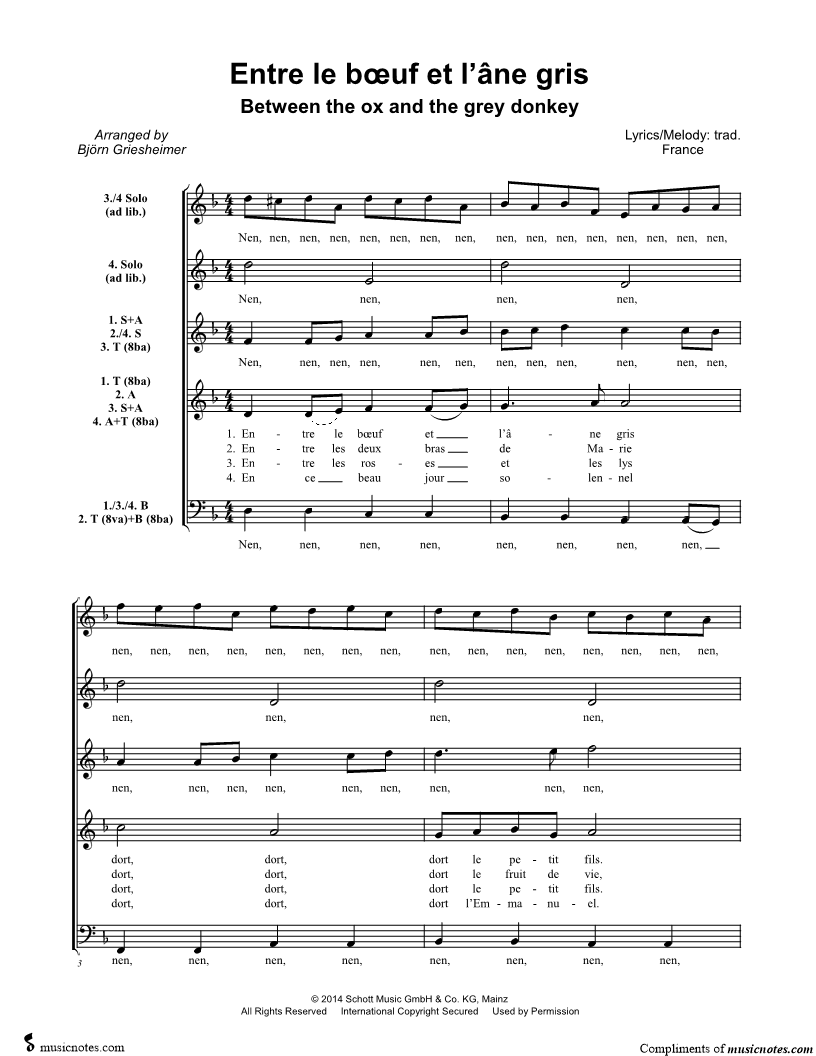 Entre le boeuf et l'âne gris dort, dort, dort le petit fils. |