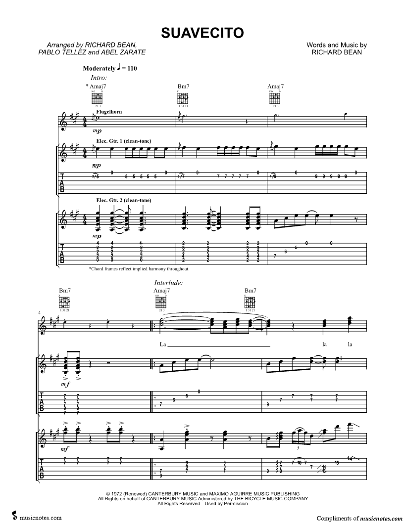 Voice 1, range: E4-C#6 Voice 2 Voice 3 Guitar 1 or Electric Guitar Guitar 2 or Electric Guitar Flugel Horn | |