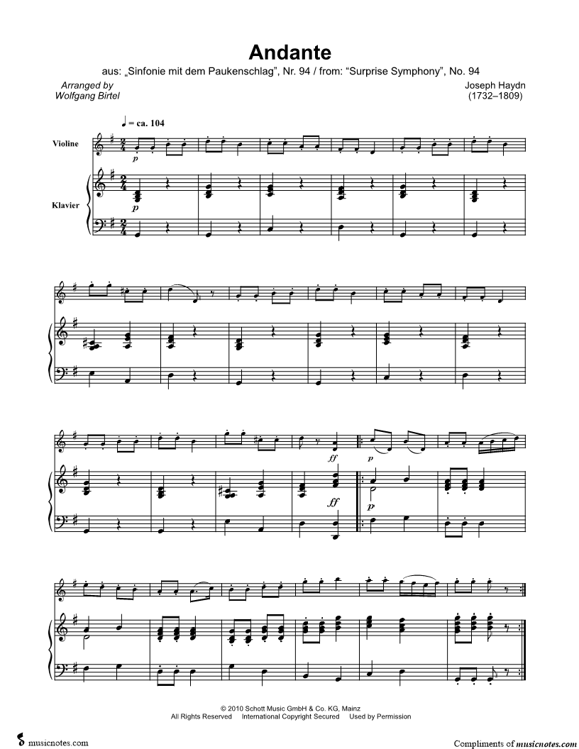 Andante from Surprise Symphony [Excerpt] - Violin & Piano |