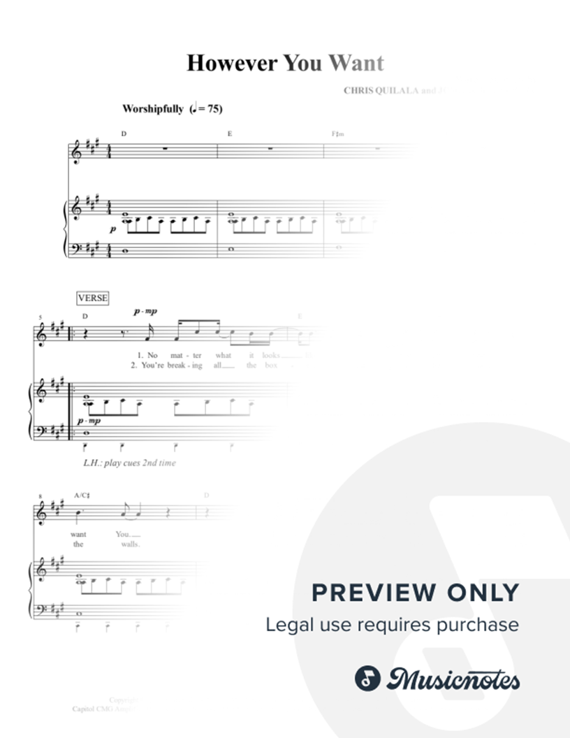 Many of the arrangements on Musicnotes have transpositions available, typically in C Major, as well as 3 sharps and 3 flats. If you do not see your desired key, you can request a transposition by reaching out to Customer Support.