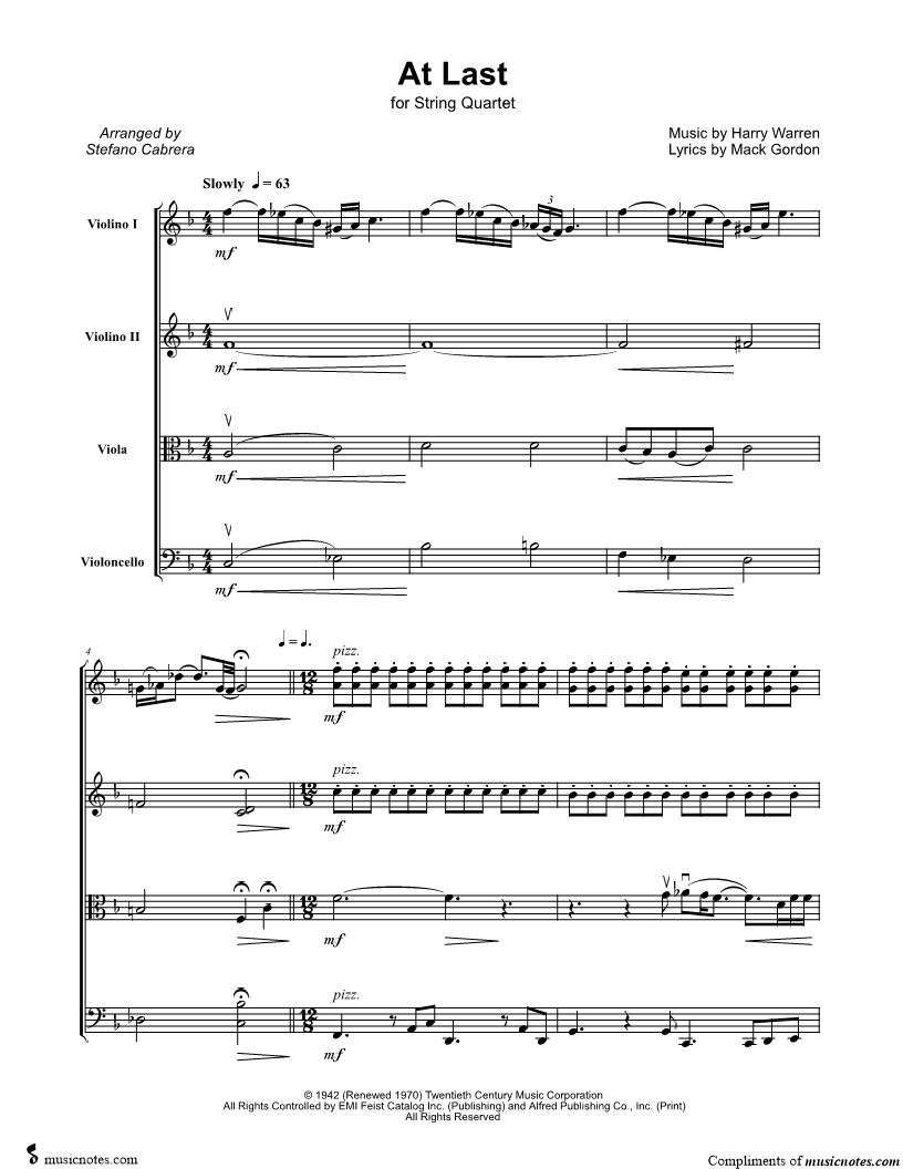 Violin 1, range: A3-Ab5 Violin 2, range: A3-F5 Viola, range: C3-C5 Cello, range: C2-G4 | |