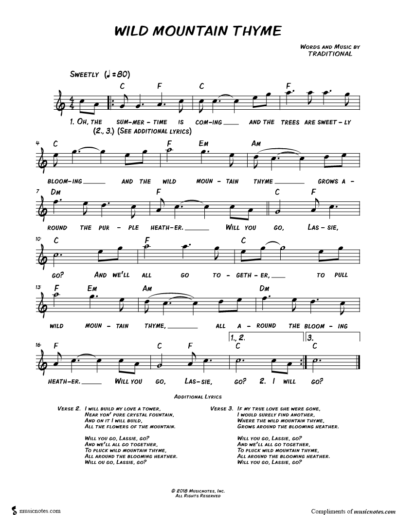 Oh, the summertime is coming and the trees are sweetly blooming and the wild mountain thyme grows around the purple heather. |