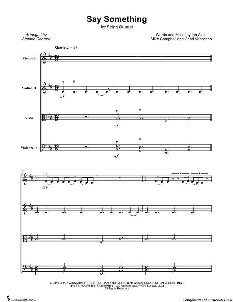 Violin 1, range: D4-A5 Violin 2, range: A3-A5 Viola, range: F#3-D5 Cello, range: D2-A3 | |