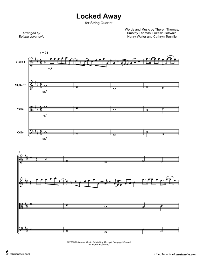 Violin 1, range: A3-B5 Violin 2, range: G3-A5 Viola, range: G3-B4 Cello, range: D2-B3 | |