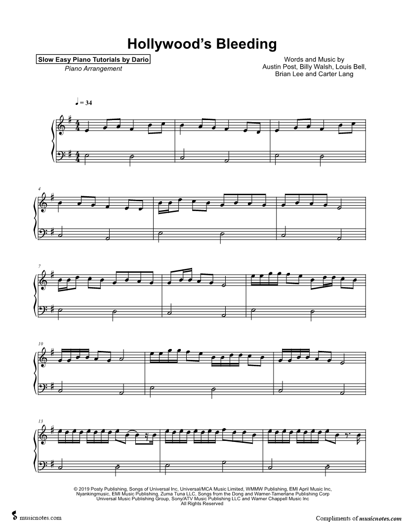 Hollywood's Bleeding [Slow Easy Piano Tutorial] |