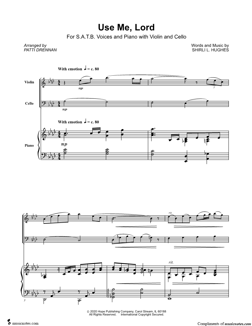 Violin, range: F4-Eb6 Cello, range: E2-E4 SATB Choir Piano Accompaniment | |