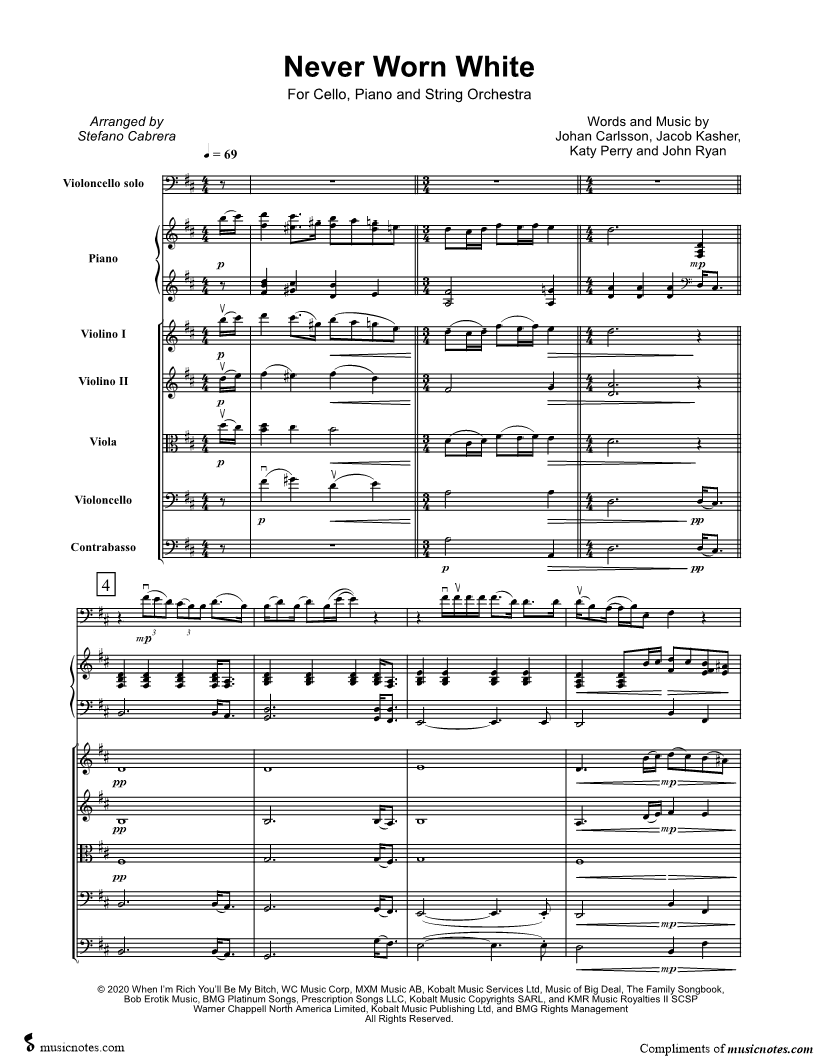 Piano Violin 1, range: A3-A6 Violin 2, range: G3-E6 Viola, range: D3-D5 Cello 1, range: D2-G#4 Cello 2 Double Bass | |