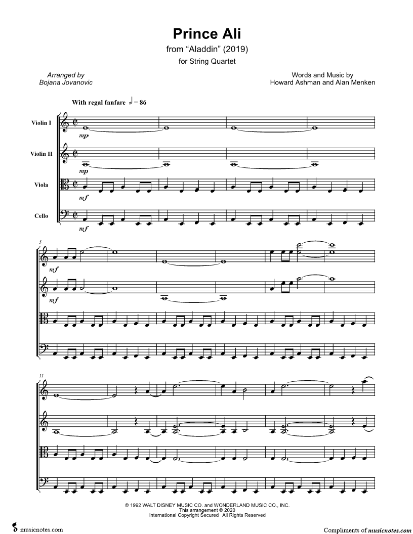 Violin 1, range: Bb3-G6 Violin 2, range: G#3-B5 Viola, range: C#3-C5 Cello, range: C2-B3 | |