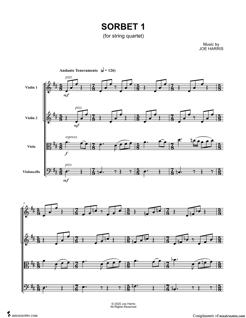 Violin 1, range: E4-G6 Violin 2, range: E4-A5 Viola, range: C3-D5 Cello, range: G2-A3 | |