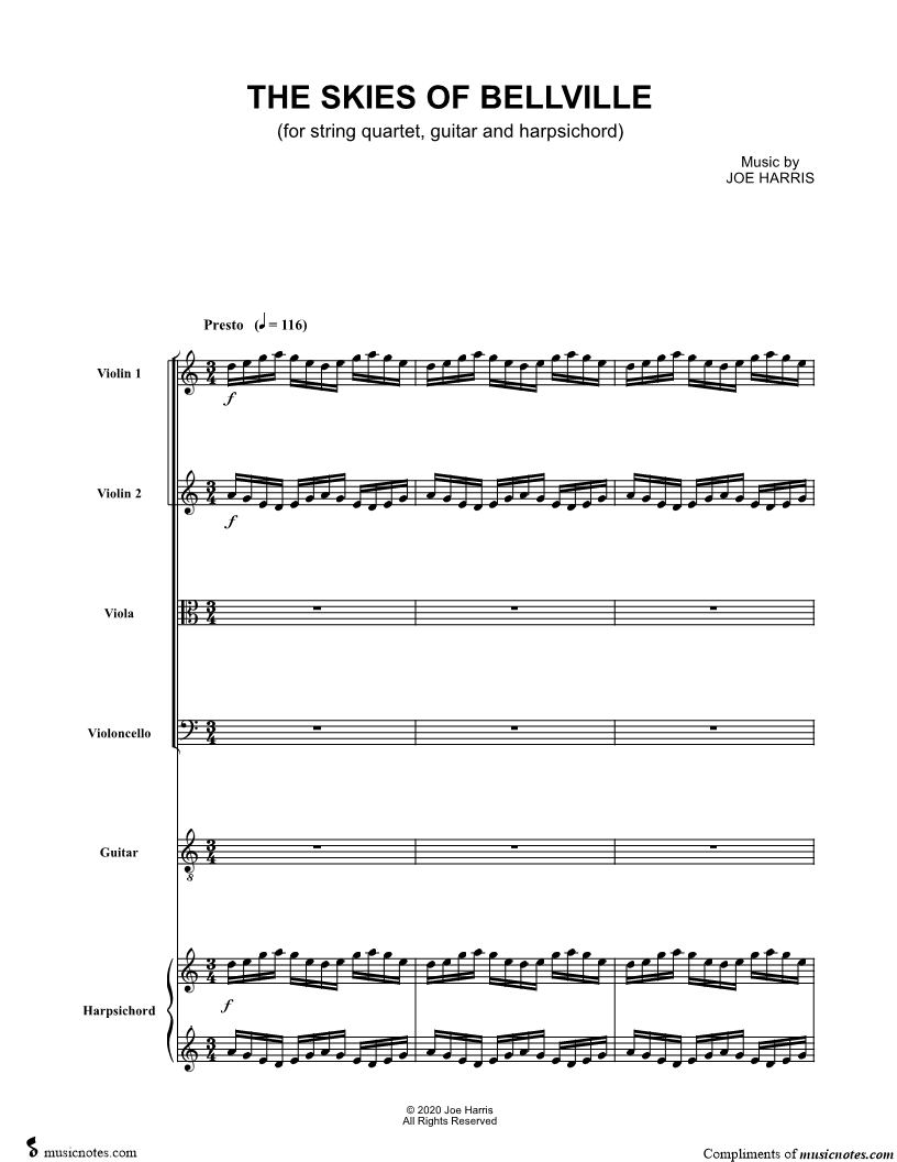 Violin 1, range: A2-G6 Violin 2, range: D4-A5 Viola, range: A3-C4 Cello, range: A2-A3 Guitar Harpsichord | |
