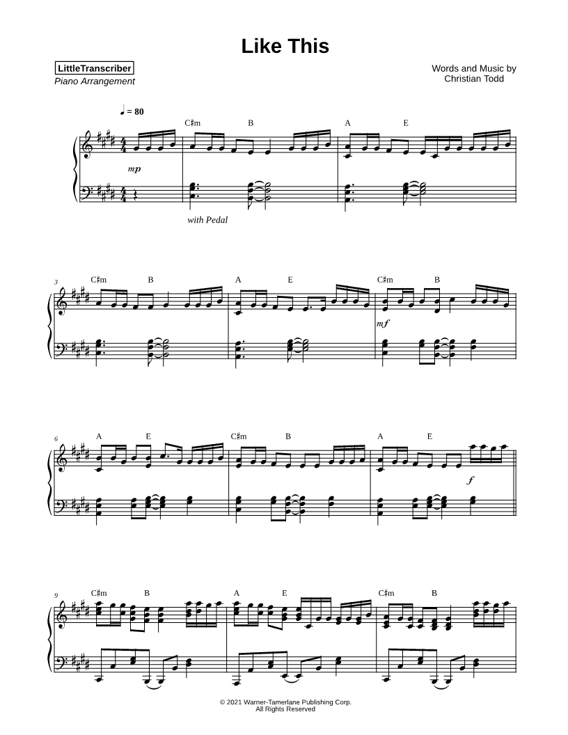 Many of the arrangements on Musicnotes have transpositions available, typically in C Major, as well as 3 sharps and 3 flats. If you do not see your desired key, you can request a transposition by reaching out to Customer Support.