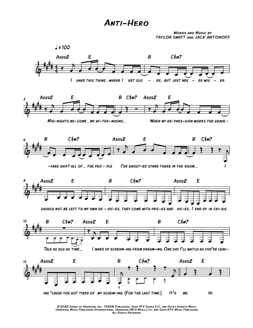 Leadsheets typically only contain the lyrics, chord symbols and melody line of a song and are rarely more than one page in length. Musicians will often use these skeletons to improvise their own arrangements. Leadsheets often do not contain complete lyrics to the song.
