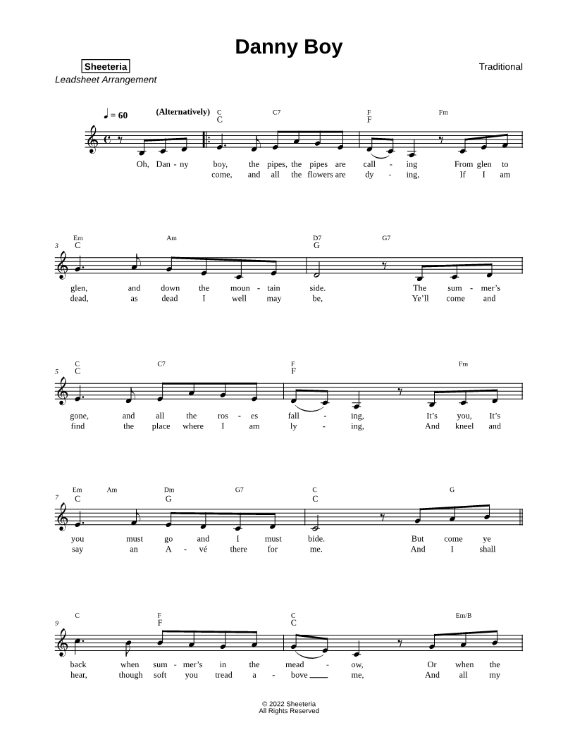 Leadsheets typically only contain the lyrics, chord symbols and melody line of a song and are rarely more than one page in length. Musicians will often use these skeletons to improvise their own arrangements. Leadsheets often do not contain complete lyrics to the song.