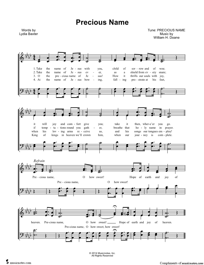 Take the name of Jesus with you, child of sorrow and of woe; it will joy and comfort give you; take it then, where'er you go. |
